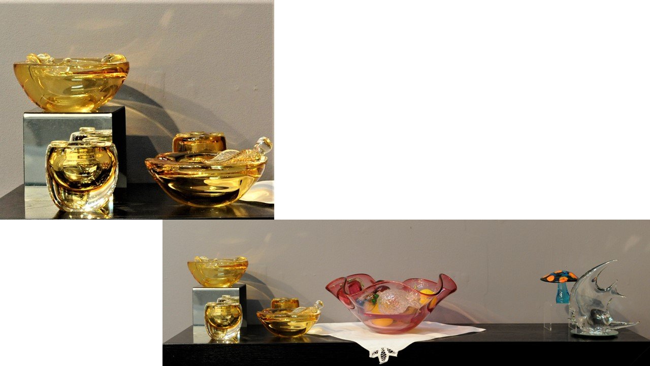 In pieces of Chalet with silver foil or gold leaf inclusions, small ultra-thin sheets of these metals were used. These silver or gold sheets were made by the precious metals having been beaten into an extremely thin leaf-like state of about 0.15 micron in width. To give you an idea of such a thin surface, this reflects about 20 grams of the precious metal covering six square meters. The sheets were then cut into small squares of about 8 cm. To infuse this gold or silver into the form, the Maestro started by rolling these small 24K gold or .925 silver sheets onto the hot glass mass during the early stage of glass-blowing. Once the gold leaf or silver foil covered most of the gather, he added a layer of clear crystal. Then, when he began to blow the glass, the metal sheet within the layers broke into smaller pieces which dispersed throughout the piece. This resulted into objects having scattered metallic pieces if differing sizes and shapes captured inside the form producing shimmering effects. These may appear close to the surface or submerged within deeper layers of clear crystal. There is no uniformity from piece to piece.