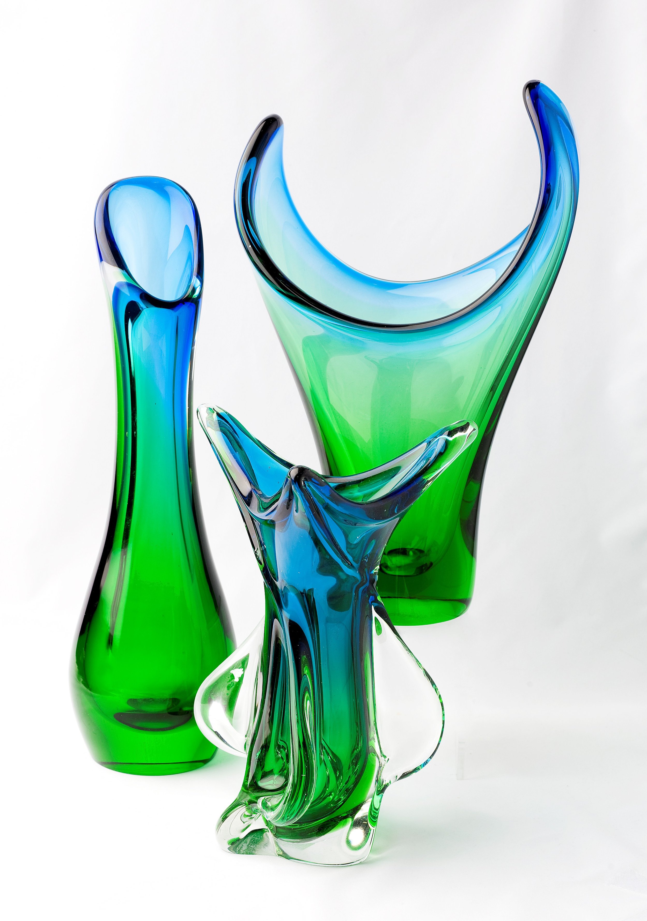 The pieces at left and middle shown here are from the collection of Cindy Bishop Laughlin and the “crystal twist” vase at right is owned by Kevin Hall.