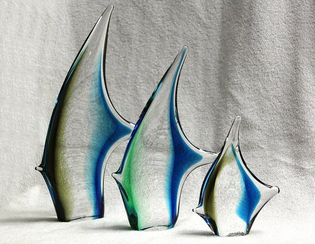 The large abstract fish figurines, 3 sizes, are seen in a multiple of 2-tone colour combinations.