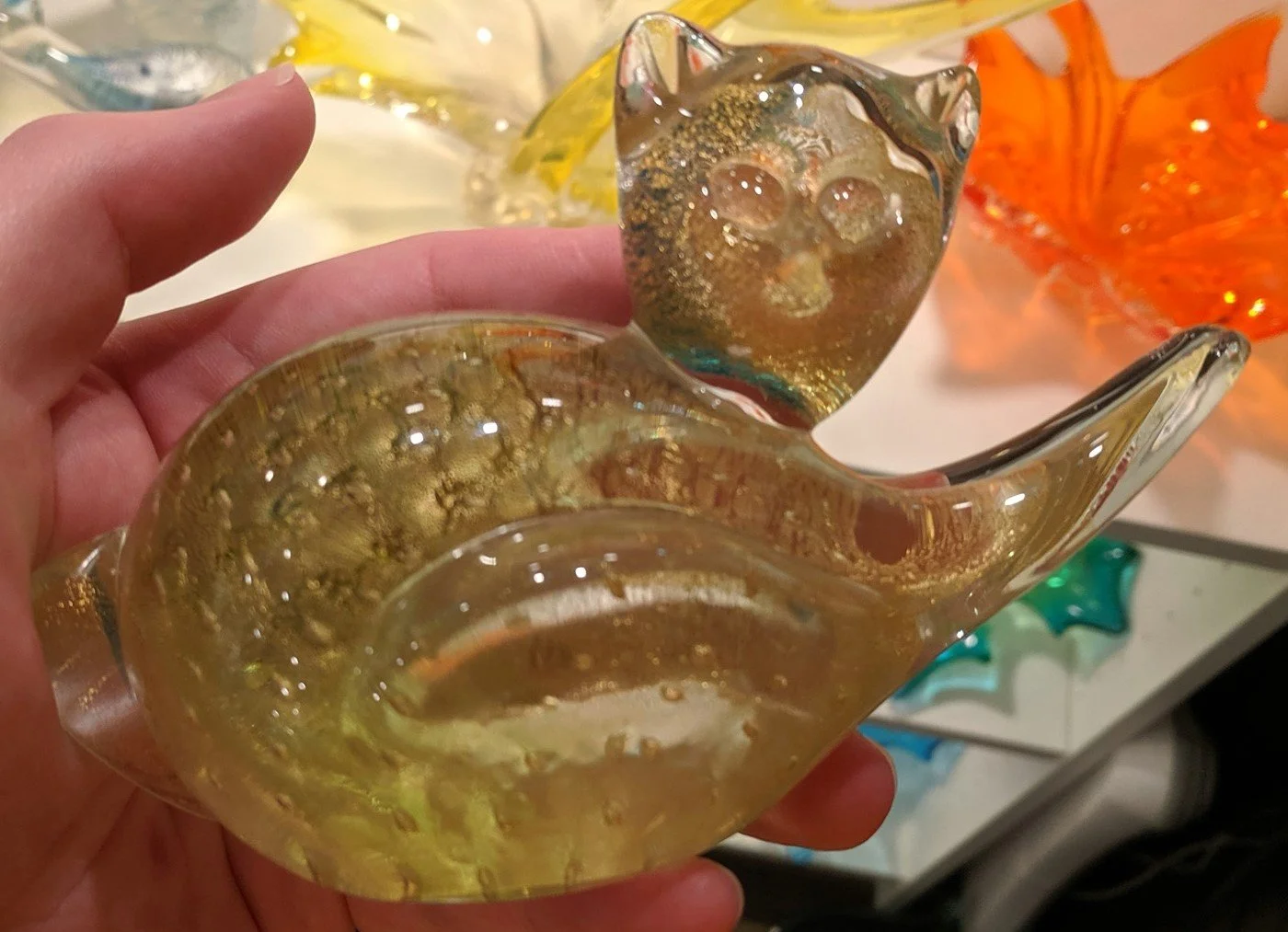 Both gold filled avventurina and gold avventurina bullicante cat figurines in the third style, the curled-up pose, have been found. Like the owl figurines, the most common colour with the gold dust fill is blue. There is one gold gold avventurina and bullicante figurine on file. However, to date, unlike the polar bears and owls, no green cat figurines have been discovered.