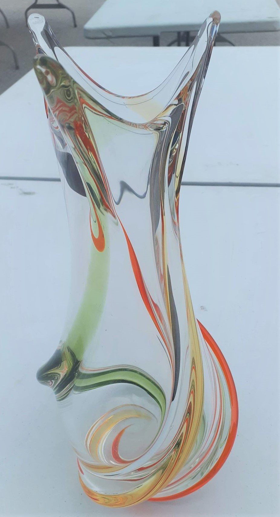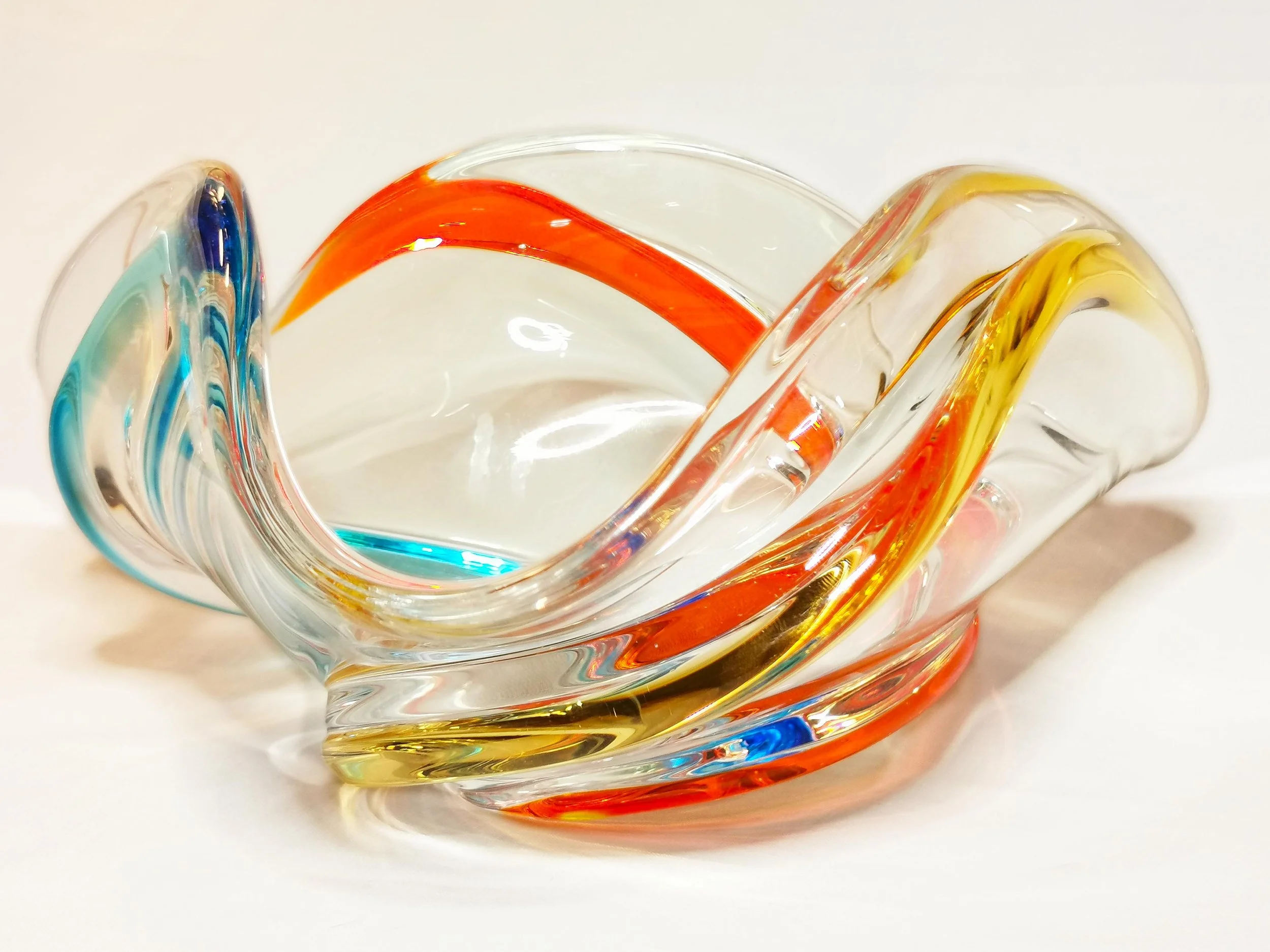 Multi-toned Chalet pieces were achieved in several ways. Through the use of 3 or more colours during the hand-blowing of the form or with the addition of coloured inclusions or applied adornments.