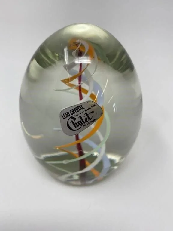 This 4 coloured inclusion “DNA” paperweight is from the collection of the Cornwall Community Museum. Photograph courtesy of curator Don Smith.
