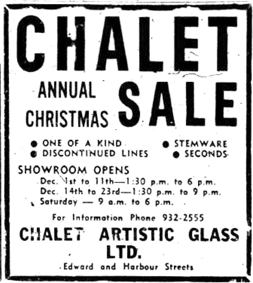 Chalet company advertising for their 1970 Christmas sale. Courtesy of the Cornwall Community Museum archives.