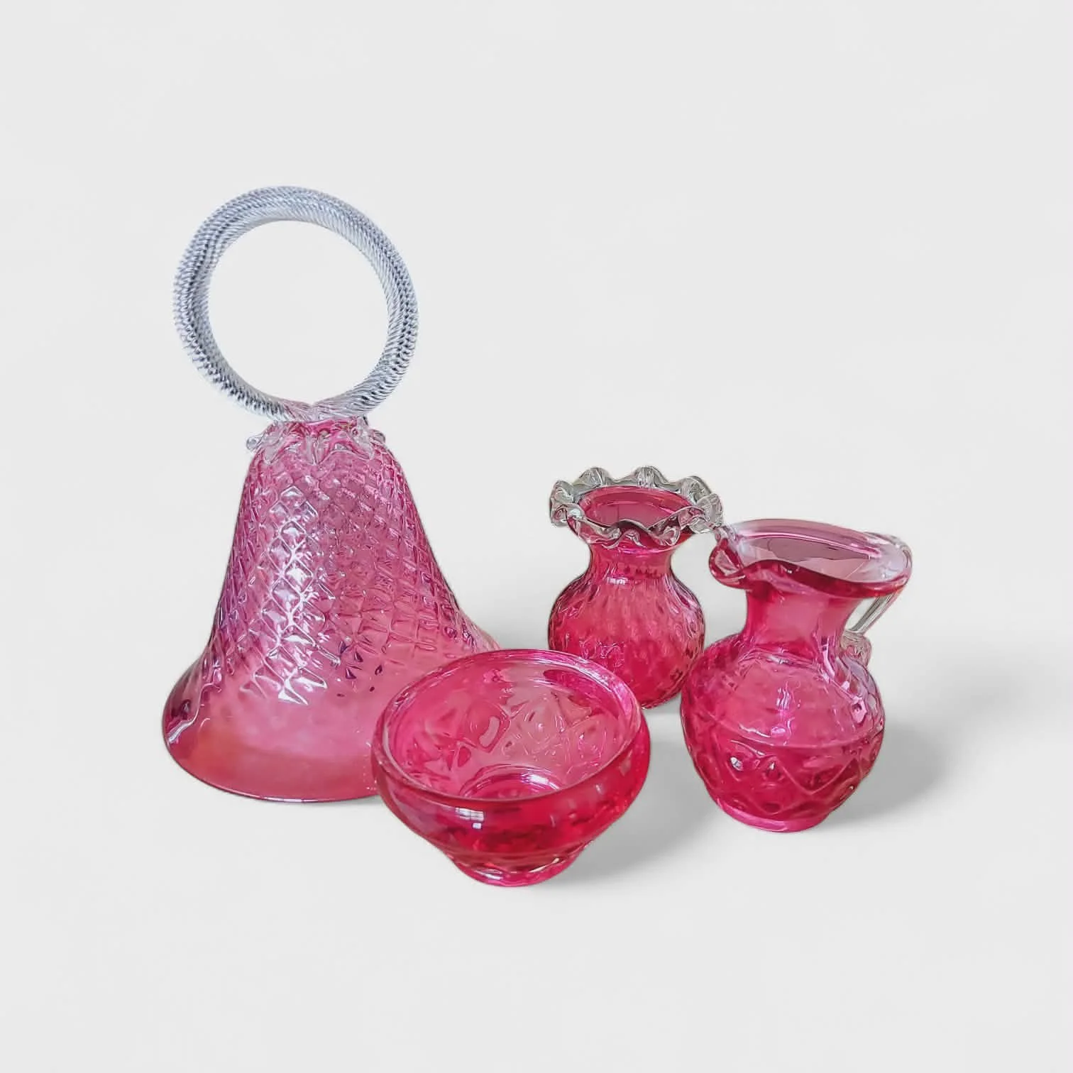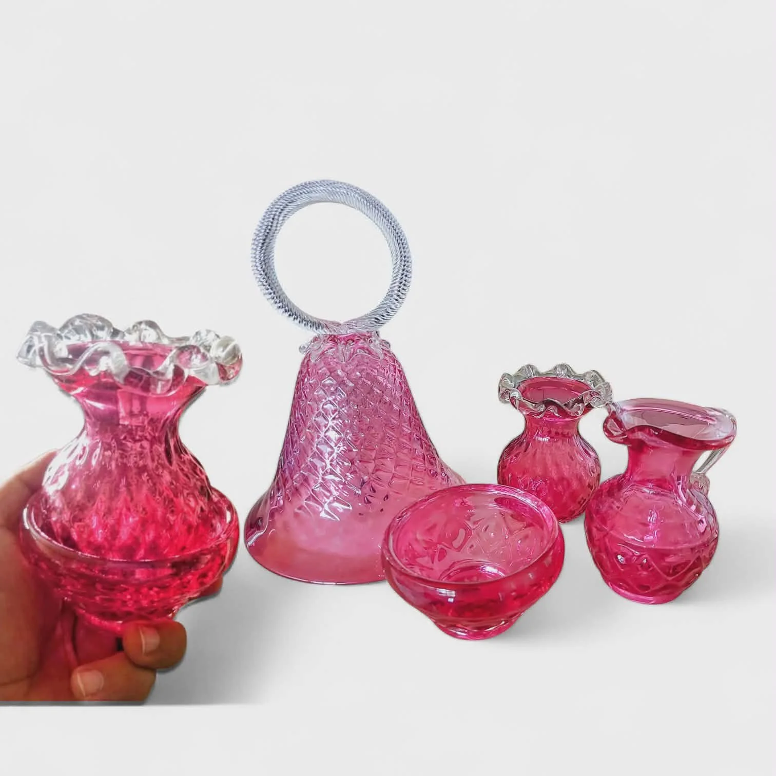 This set done in the Chalet “End of Day is missing the handled “Altar or Eucharist” bell made in either cranberry or clear crystal. It does have the handled pitcher for the wine, the handless vase-like vessel for the water and the small bowl for the wafers.