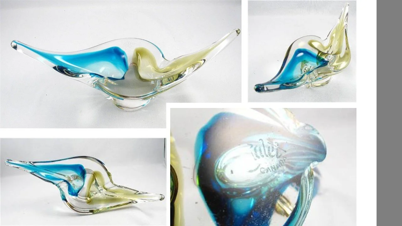 However, I did have some theories. I know they would have been made by a Master as they are not production pieces, very beautifully done and unusual with the dividers and distinct colour separation. That led me to think they were done by either Maestro Sergio Pagnin or Maestro Luigi Tedesco – Chalet owners as well so they had the authority, access and resources to create test pieces and talent to envision these stunners. I suspected they could have been test pieces for a line that did not go forward. Perhaps they were thinking of creating another 2-colour combo line like the blue/emerald-green line. And these pieces are consistently etched with the “Chalet Canada” signature which also shows that they were done with the intention of distribution. The numbers in which they have been found also bear this line of reasoning out – very rare but seen often enough that we can surmise they were not done for personal collecting. Another reason for my thinking was that we have found a variety of 5 forms –vertical centerpieces, horizontal centerpieces, vases, baskets and 2-butt ashtrays. Moreover, each of these shapes appear to have been made in two different styles.