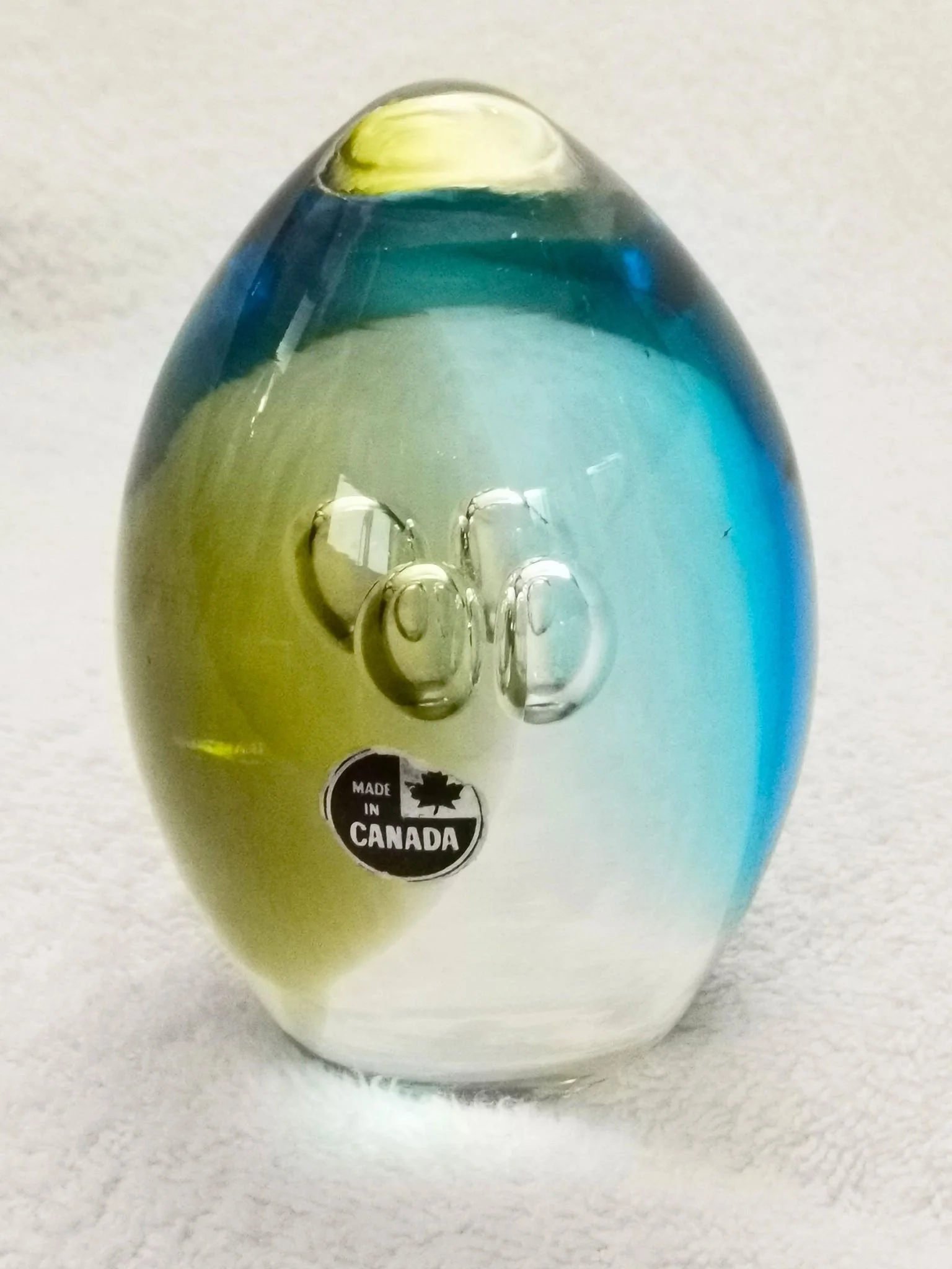 Even rarer than Chalet paperweights are ones produced by Lorraine Glass Industries. to date, we have found only 2 that we can verify. They are also egg shaped. They do not include inclusions. Rather, they are 2-toned and have interior bubbles. Both retain the oft seen the round black and gold “Made in Canada” label Lorraine used.