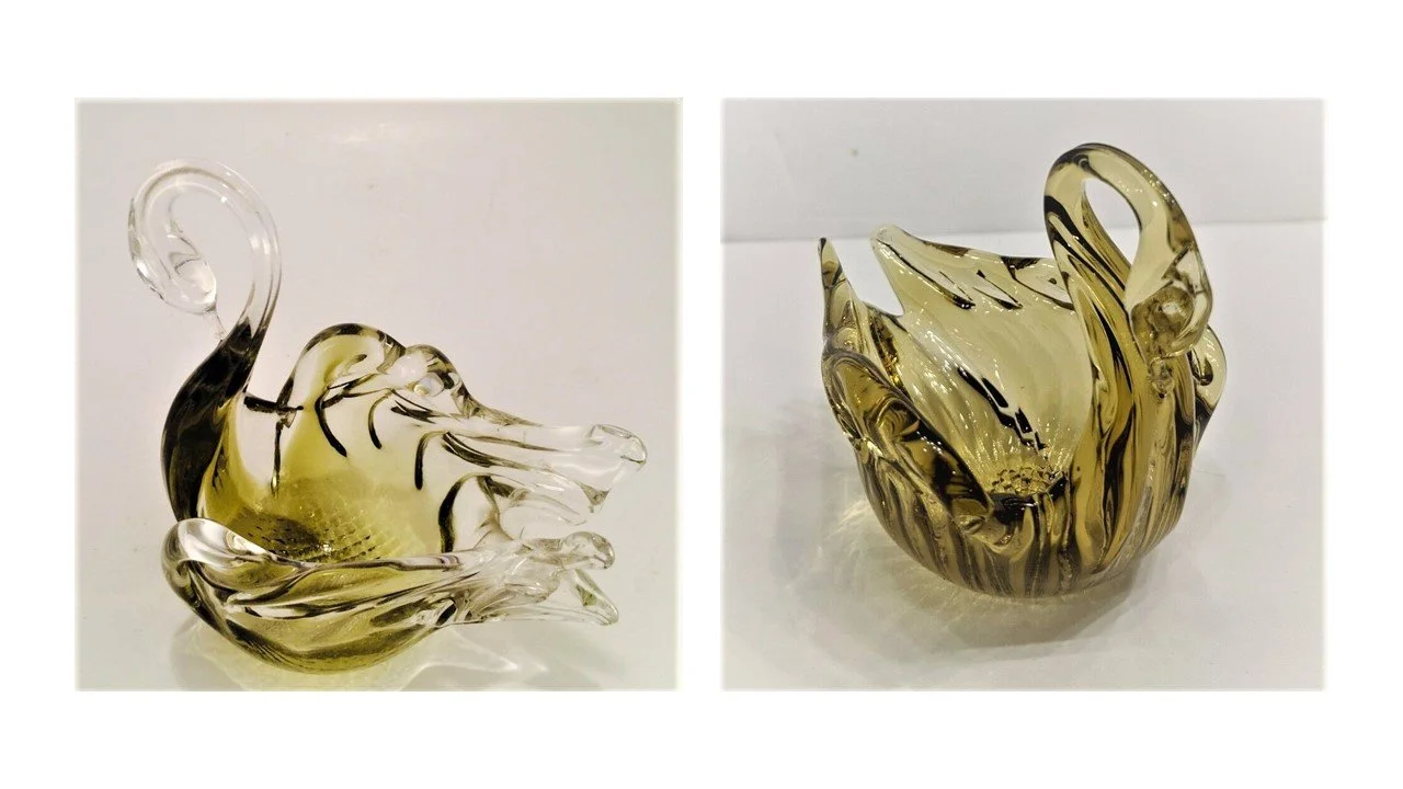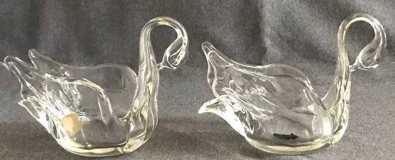 The Rossi “Heritage Glass Collection” stickered piece at left is from the collection of Kevin Kodak. The Chalet swan bomboniere at right.
