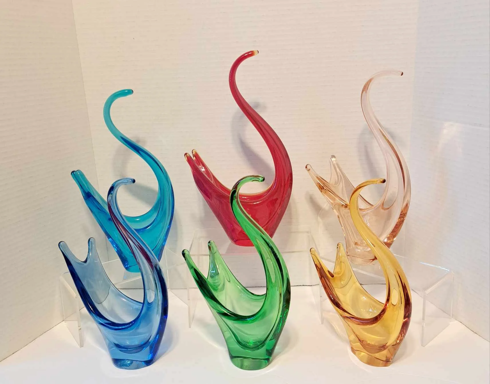 Rossi used an irradato finish on the majority of his coloured bomboniere. A “id tell” – if an unmarked bomboniere is amber or grass green, it is not a Rossi made piece – it is Chalet. Rossi did not produce bomboniere pieces in those colours. Rossi pieces are generally pinks and blues – with the odd colour, such as the orange shown center below, thrown into the mix.