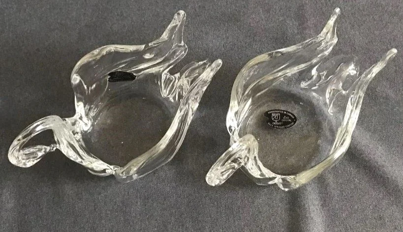 Hand-molded clear crystal swan candleholder bomboniere are also common. The base of a candleholder bomboniere is always flat. Very often you will find that the mold marks have been ground off to ensure that it will rest completely level – for obvious reasons. One such example: