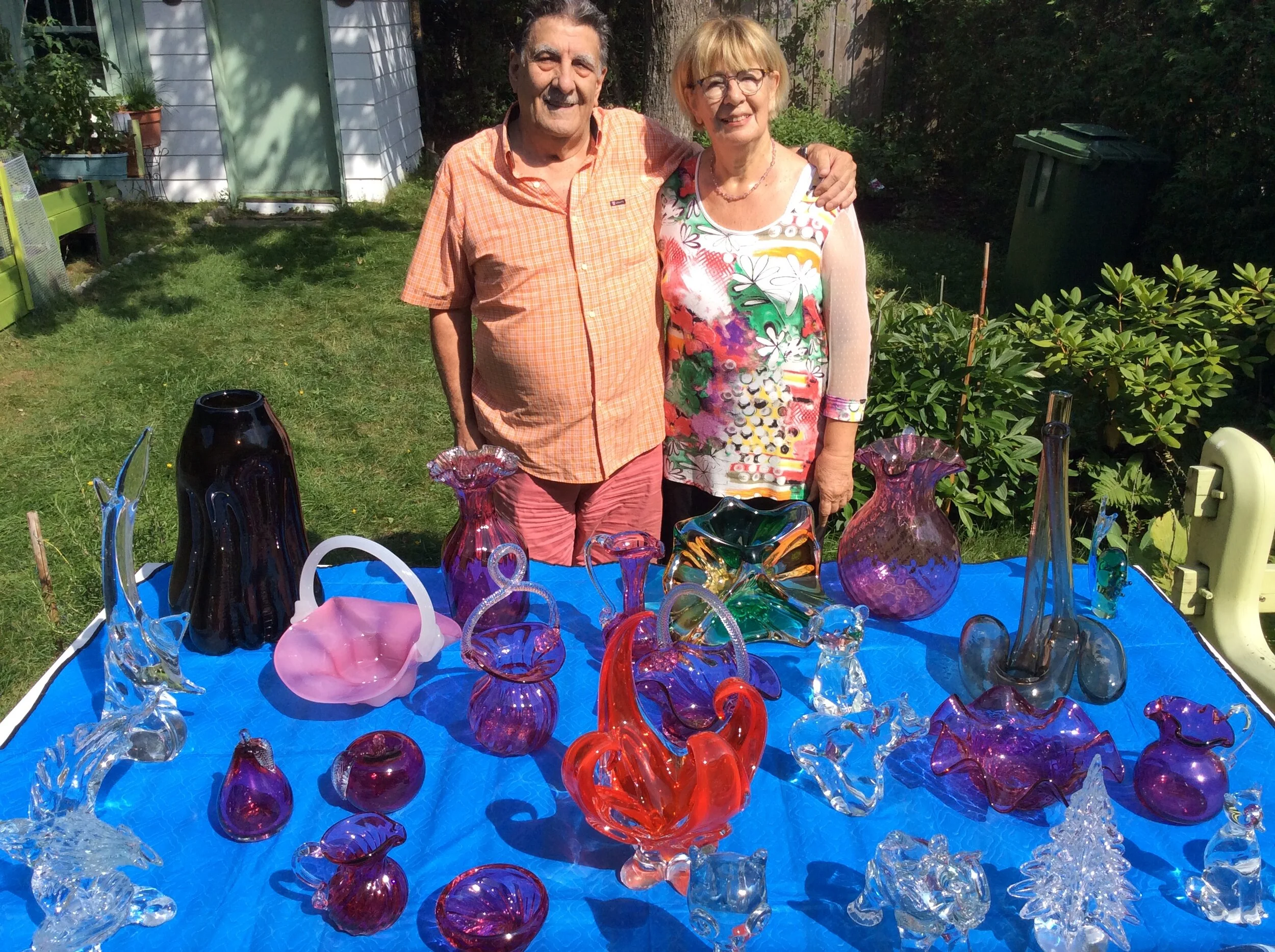 August 2020. Danielle Gatto and Maestro Gatto with a few of the pieces he made at Venice Art Glass, Lorraine Glass Industries, Mosaic Artistic Glass, Chalet Artistic Glass, Christallerie Chalet Vie et Art and Rossi Glass. Note that the vase shown above (far left back) is still in his possession over 45 years later. Photograph courtesy of Danielle Gatto. Sadly. Maestro Gatto passed away August 11, 2024.