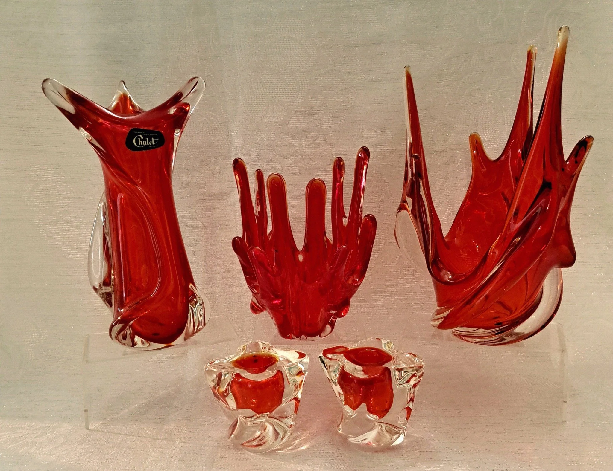 Chalet cranberry "spike and curls" are not common. Dwain Robertson certainly cherishes his. Lovely example of how Chalet used up excess colour at the end of the day. Can you imagine that they considered these "pink Chalet" heavy lead crystal pieces to be seconds! The artists were stunned when discussing this, I told them how valued and sought after these pieces are today.